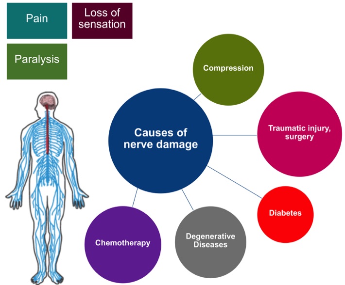 Nerve fibers, the so-called axons, conduct motor signals from the brain and spinal cord to their peripheral target organs like muscles. Conversely, sensory signals arrive via the peripheral nervous system (blue) from the skin to the spinal cord (red). Axonal damage to nerves (e.g., through compression, accidents, diabetes, chemotherapy) cause the interruption of nerve conduction and lead to corresponding declines in function like paralysis, loss of sensation, and chronic pain. A developing peripheral neuropathy significantly affects the patient´s quality of life and ability to manage everyday activities. Although injured peripheral nerves can regenerate in principle, functional recovery depends mainly on the spontaneous axonal regeneration rate. In particular, long regeneration distances are problematic due to the limited axonal growth rate of approximately 1-2 mm per day. This would mean a regeneration period of several months to years in cases of nerve damage to the legs and arms. Full recovery is often not possible as the long regeneration time can lead to irreversible damage to the target structures. Treatment is, therefore, very tedious and associated with high treatment and rehabilitation costs. Current therapy options are limited to surgical procedures (including nerve release, nerve suture or bypass) and conservative interventions such as physical therapy and electrostimulation. In addition to the regeneration distance, the type of damage, and the time of treatment also influence the success of regeneration. A clinically established therapy that can accelerate the growth of nerve fibers and thus qualitatively improve therapy outcome is not currently available.