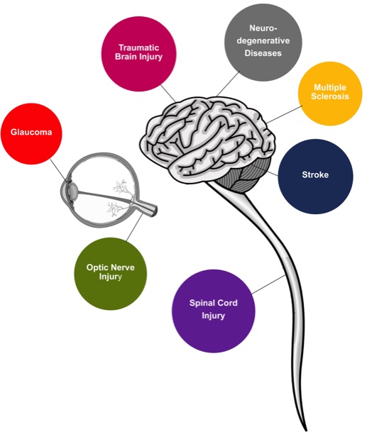 Multiple sclerosis (MS) is a chronic inflammatory autoimmune disorder and the most common neurological disease in young adults beside epilepsy. So far, the particular causes of the disease have not been resolved. However, it is scientifically accepted that the body's immune system attacks and destroys the myelin sheath in the white matter of the brain and spinal cord, resulting in inflammatory plaques. The myelin sheath is the insulating layer surrounding the axons of nerve cells and formed by oligodendrocytes in the CNS. The destruction of the myelin sheath results in disturbed signal transmission along the axons and ultimately the symptoms of MS. Initially, patients often suffer from relapsing-remitting forms of MS meaning that periods of inflammation and the corresponding symptoms are followed by phases without symptoms and less inflammation. The reason that symptoms disappear during the remission phase is an intrinsic repair mechanism called remyelination. During remyelination, oligodendrocyte precursor cells differentiate and form new myelin, restoring axonal function. However, as the disease progresses, this repair mechanism ultimately fails, and the remaining axons die. The patient then develops a secondary, progressive form of MS where clinical symptoms no longer improve. In principle, inflammatory lesions may occur in each area of the brain, therefore, symptoms are diverse. At the beginning of the disease, the optic nerve is commonly affected, resulting in vision problems. The standard treatments of MS primarily aim to modulate the immune system, to prevent relapses and delay axonal damage as long as possible.